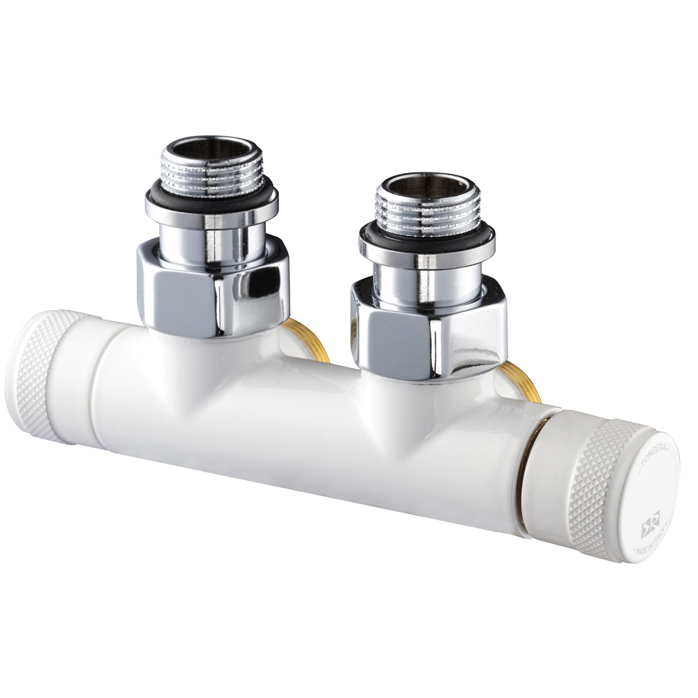 Узел SR Rubinetterie серии Tondera угловой для нижнего подключения радиаторов — двойной запорный клапан. Межосевое расстояние 50 мм, соединение для медных или многослойных труб, резьбовые переходники для подключения к радиатору с герметичной прокладкой.