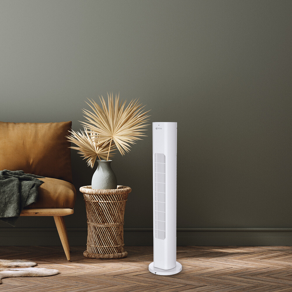 Колонный вентилятор имеет множество настроек, которыми удобно управлять с помощью пульта ДУ, либо электронной панели управления. Прибор имеет 3 скорости работы и широкоугольный поворот в горизонтальной плоскости. Узкая лаконичная конструкция вентилятора занимает минимум места по полу.