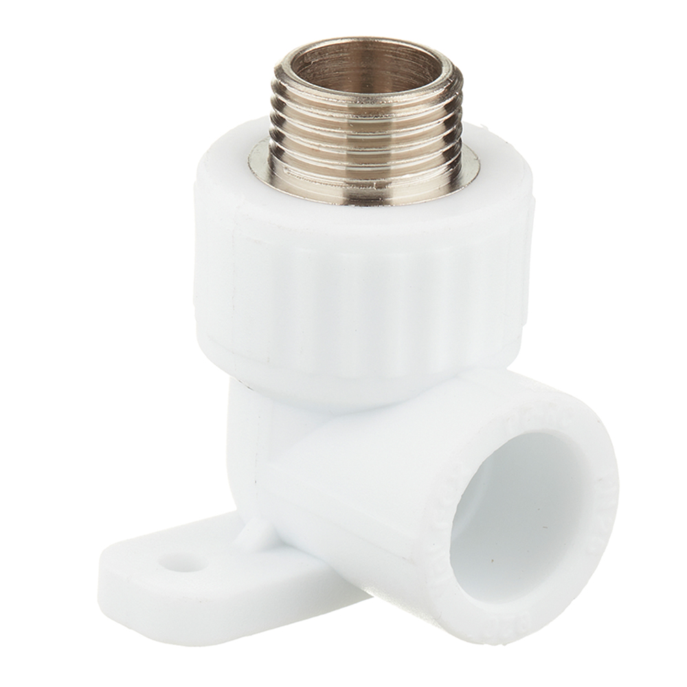 Предназначена для фиксации фитинга к несущей поверхности предусмотрена опорная планка с отверстиями под крепление метизами, для подсоединения к полипропиленовому трубопроводу сантехнического смесителя или поливочного крана, а также других элементов инженерной системы с резьбовым подключением. Представляет собой комбинированное изделие из полипропиленового фитинга внутри которого установлена никелированная латунная закладная, круглого сечения с поперечными проточками и торцевыми выступами увеличивающими поверхность сцепления с полипропиленом. Конструкция обеспечивает надежную фиксацию закладной детали в осевом и радиальном направлении, что гарантирует герметичность фитинга во всем диапазоне рабочих температур.