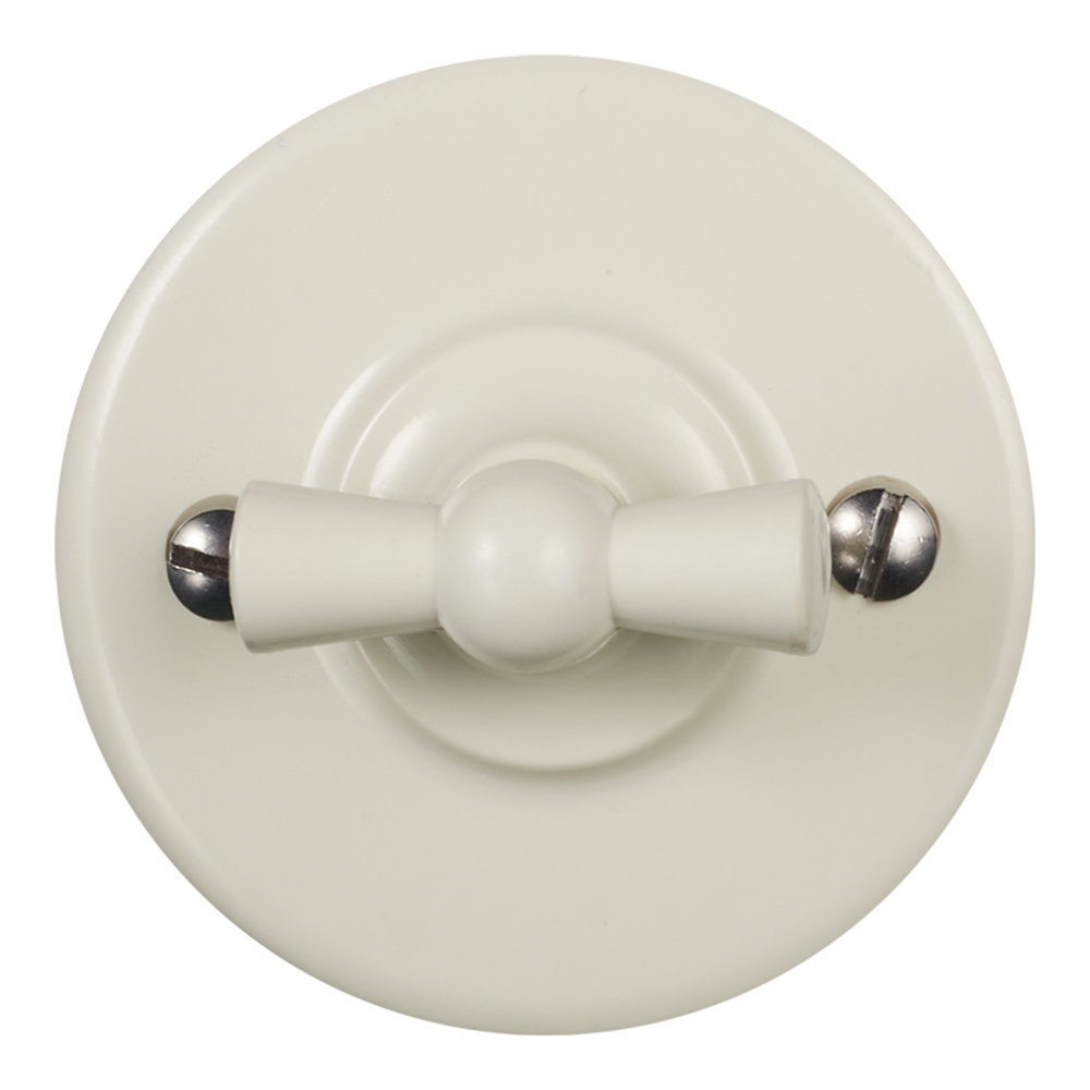 Предназначен для включения и выключения света. Изготовлен из высокопрочного пластика, устойчивого к истиранию. Оснащен поворотным переключателем вместо клавиши. Применяется с открытой проводкой, хорошо сочетается с текстильным кабелем. При необходимости может использоваться и при монтаже скрытой электропроводки.