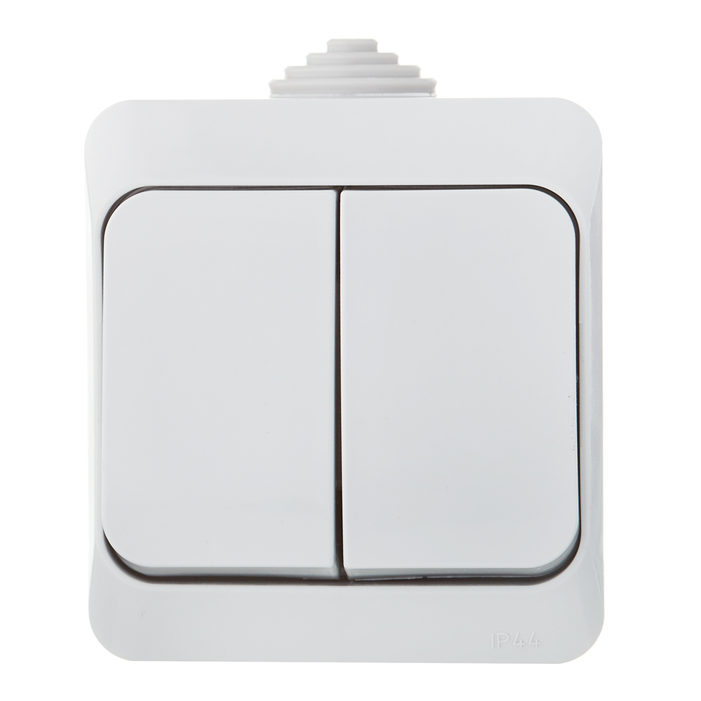 Предназначен для включения и выключения света при внешней проводке и имеет степень защиты от влаги IP44, которая позволяет устанавливать выключатель на улице или в бане.