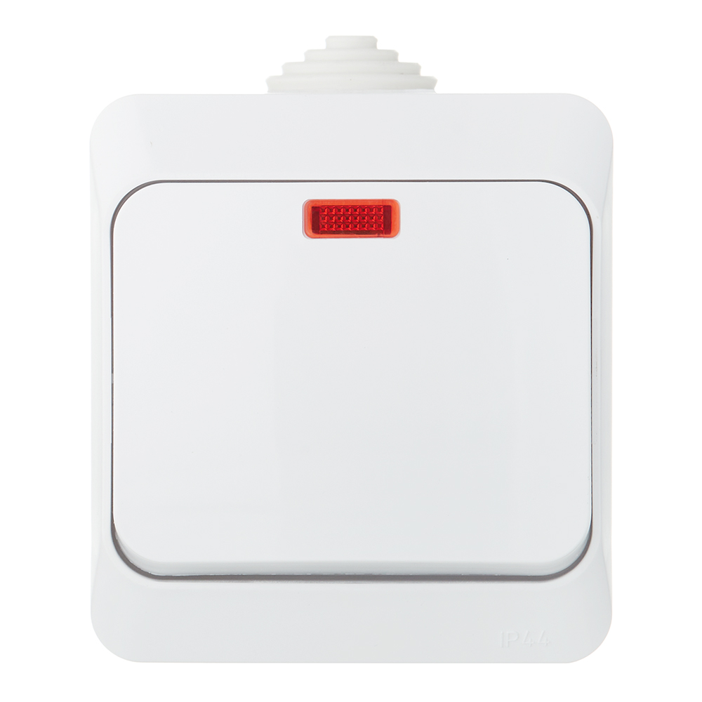 Предназначен для включения и выключения света при внешней проводке и имеет степень защиты от влаги IP44, которая позволяет устанавливать выключатель на улице или в бане.