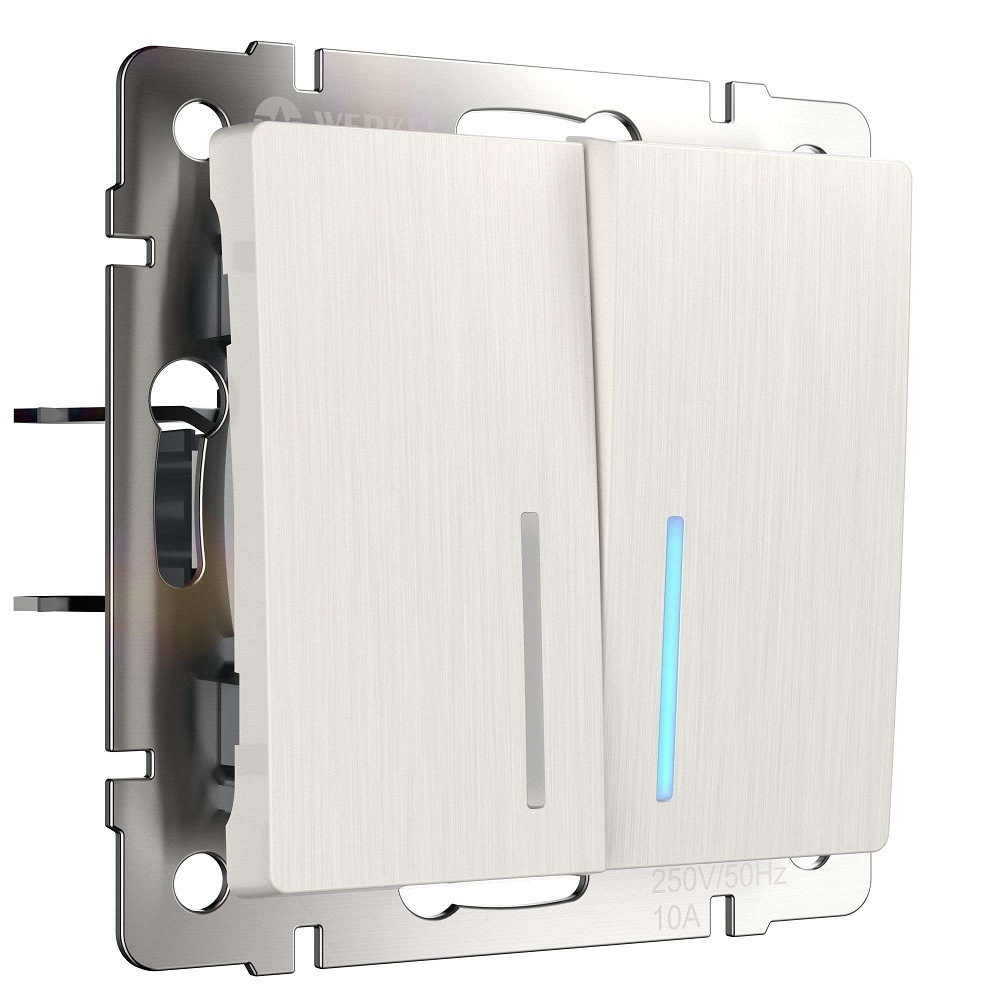 Выключатель двухклавишный с подсветкой перламутровый рифленый W1120113 совместим со всеми рамками из коллекций Werkel™ это позволяет создавать оригинальные, стилевые и цветовые комбинации.