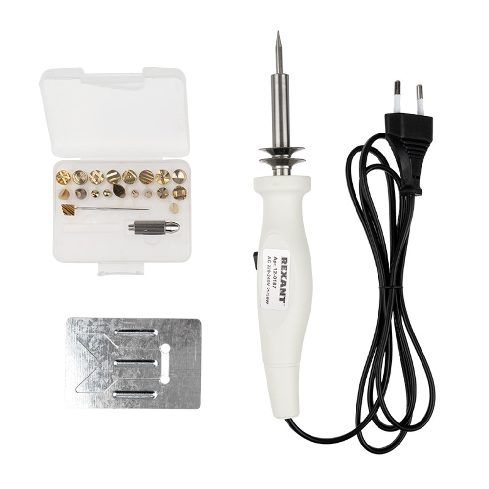 Комплектация: Паяльник, жало для пайки, выжигательные насадки — 19 шт., насадка-нож с цанговым зажимом, металлическая подставка.