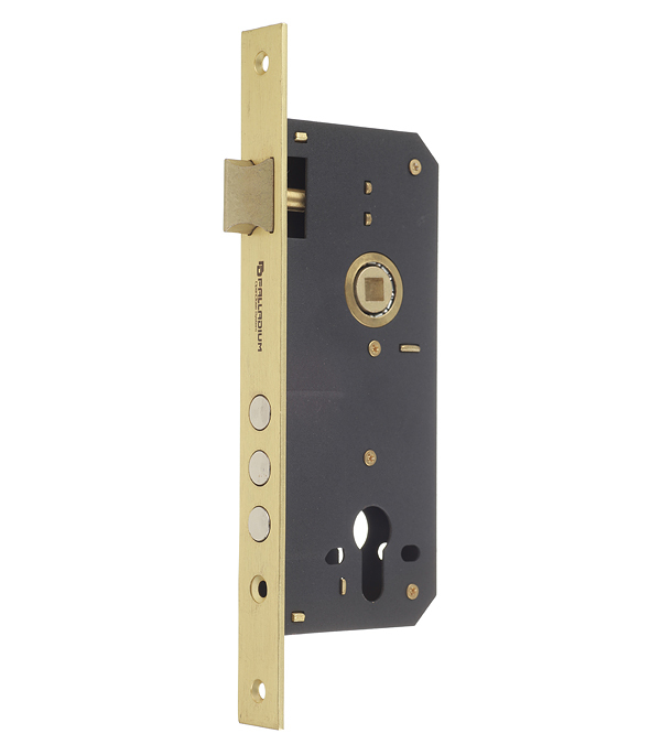 Врезной замок для межкомнатных и входных дверей. Комплектуется латунным евроцилиндром с 6 пинами и закаленными вставками против высверливания твердостью 62HRC. Имеются дополнительные отверстия для установки раздельной фурнитуры и броненакладки.
