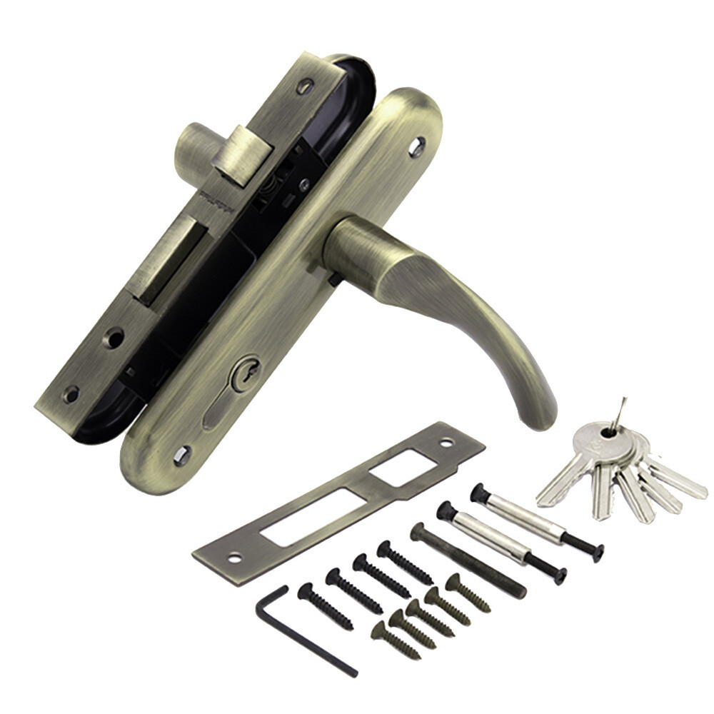 Комплектация: замок врезной, 2 ручки на планке, цилиндровый механизм 5 пинов, ответная планка, пластиковая вставка под ответную планку, квадрат, стяжные винты для крепления ручек, шурупы в цвет планки, 5 английских ключей.