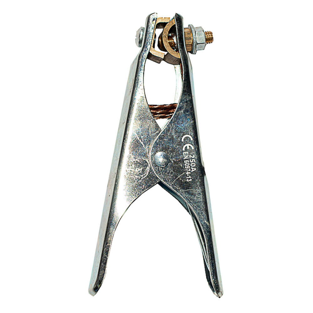 Клемма заземления обеспечивает хороший контакт с рабочей деталью при помощи медного соединения. Это дает чистый переход тока с рабочей поверхности на сварочный кабель. Клемма также имеет омедненное соединение между верхней и нижней контактной точкой, что обеспечивает постоянное течение тока, даже если одна из точек присоединена не полностью 250А