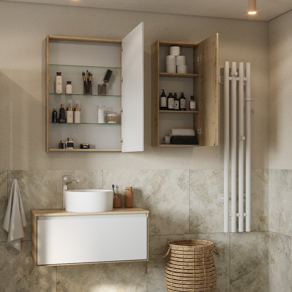 Зеркальный шкаф имеет нестандартную высоту – 95 см. Этот шкаф прекрасно подойдет для любой ванной комнаты и поможет визуально увеличить пространство благодаря своей высоте и компактной ширине. Он выполнен из влагостойкой ЛДСП в текстурированной древесной отделке. Боковины обработаны по особой технологии, создающей эффект тонких линий и в то же время сохраняющей надежность конструкции. Зеркальный шкаф оснащен 3 регулируемыми стеклянными полочками, которые установлены на специальные фиксаторы, предотвращающих опрокидывание. Более того зеркальный шкаф реверсивен, достаточно перевернуть изделие на 180 градусов.
