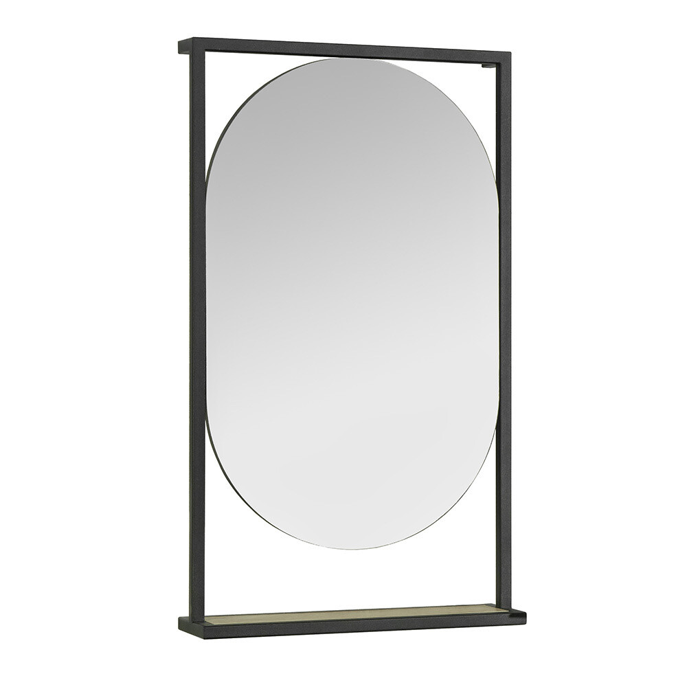 Зеркало Лофт Фабрик отличается необычным оригинальным дизайном и удобным функционалом. Черные металлические профили в форме прямоугольника обрамляют овальное зеркало, под которым находится полочка из влагостойкой ламинированной плиты в цвете Дуб Эндгрейн. Открытая полочка удобна для косметических и декоративных мелочей, которые всегда должны быть под рукой.